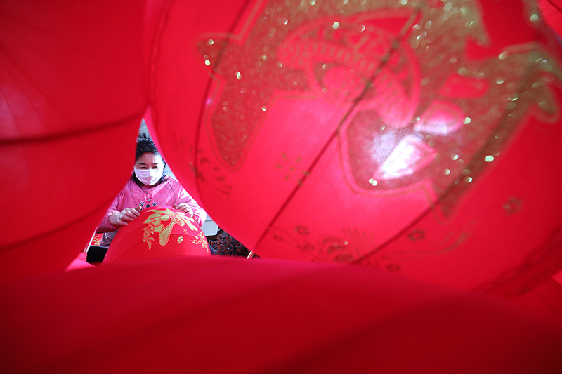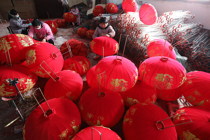 1月10日,焦作市温县赵堡镇赵堡村一家灯笼作坊的工人在赶制红灯笼。