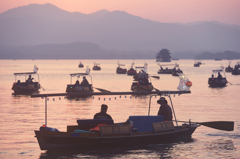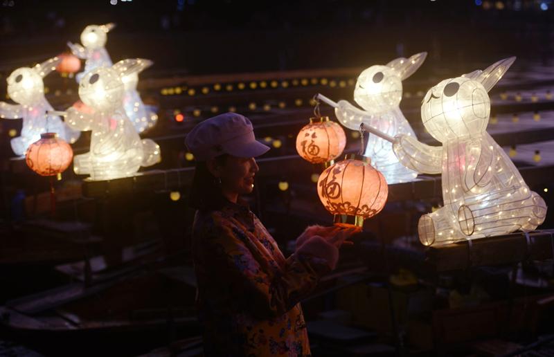 随着农历癸卯兔年临近,日前,30艘装有“玉兔灯”的手划船集中亮相杭州西湖,供市民游客乘坐、赏灯游玩,热热闹闹迎接新春佳节。