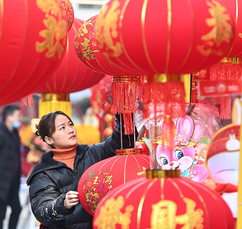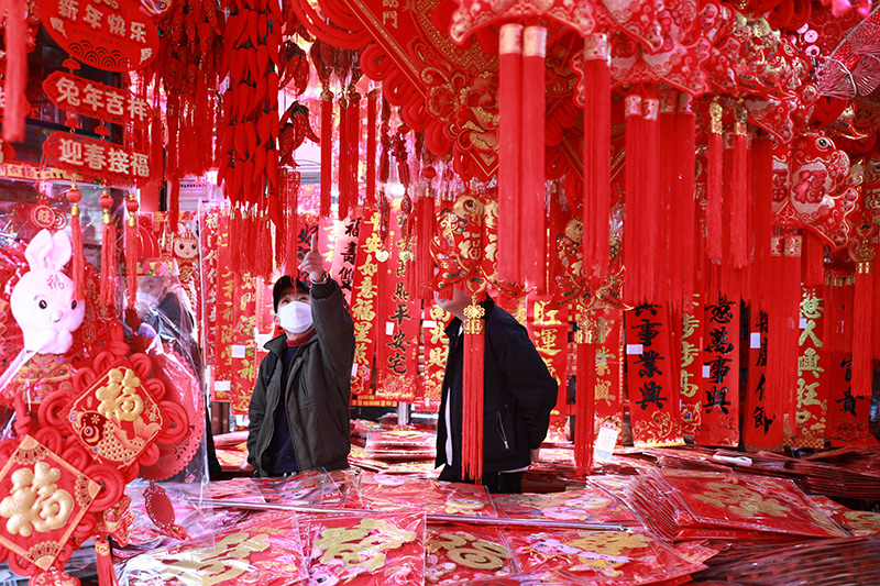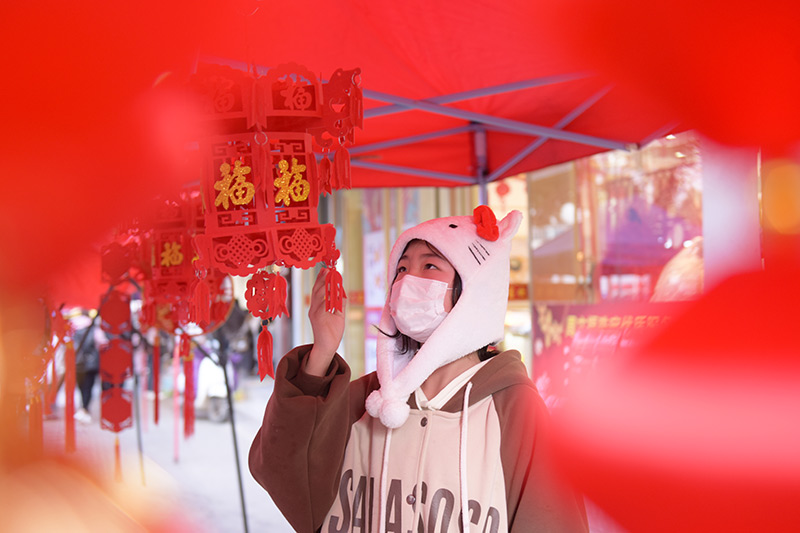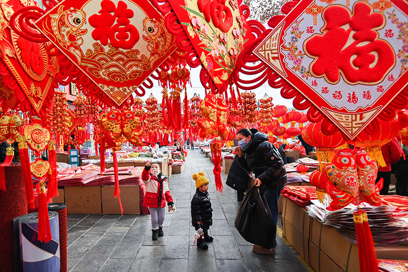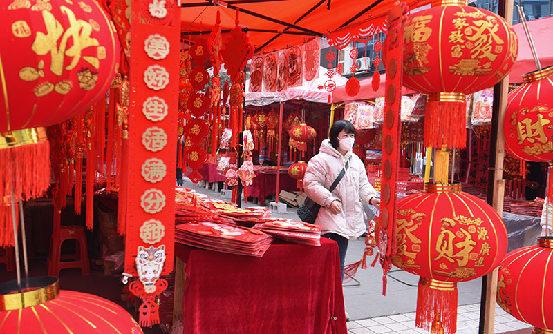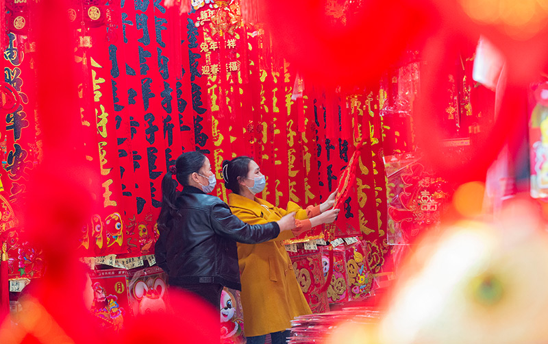 临近春节,各地年货市场热热闹闹,人们忙着选购新春饰品。
