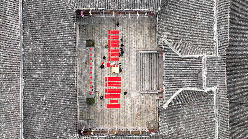 1月12日,在重庆市酉阳土家族苗族自治县龚滩古镇,居民在写春联(无人机照片)。