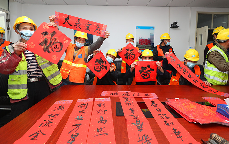 当日,在中建二局华东公司上海谈家桥项目工地,来自谈家桥社区的书法爱好者为工人师傅们现场写春联和福字,送上春节祝福。