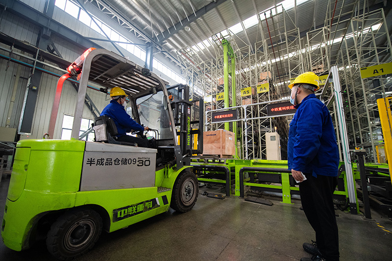 1月13日,在位于常德高新区的中联重科建筑起重机械有限责任公司生产车间,工作人员把生产的产品零部件入库。