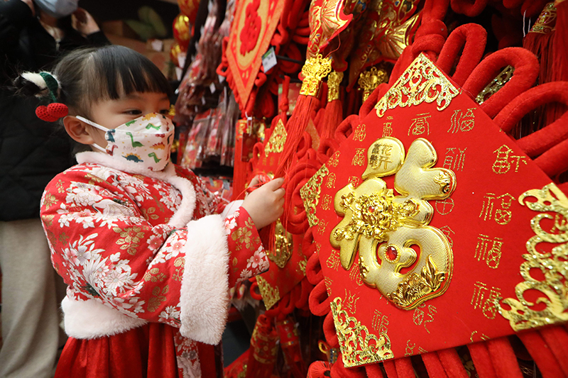 1月13日,小朋友在贵州省贵阳市开阳县一家超市选购春节饰品。