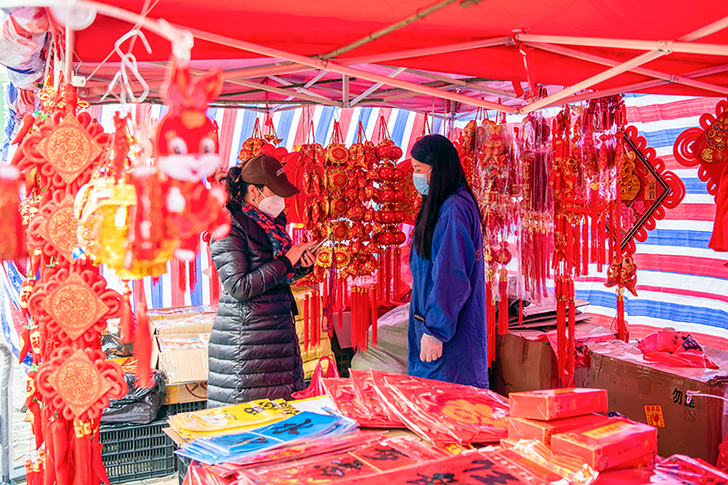 1月12日,在安徽省芜湖市繁昌区繁阳镇城北农贸市场,市民选购年货饰品。