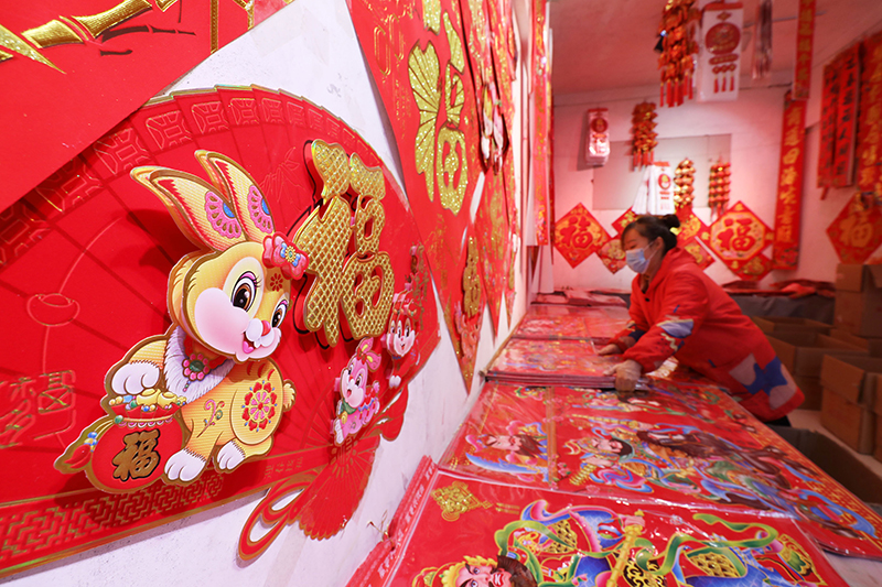 1月13日,在河南省焦作市温县赵堡镇赵堡村年货市场,商户在整理春联、福字等饰品。