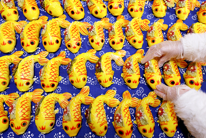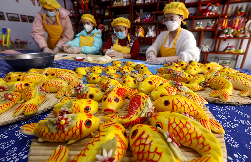 1月13日,山东省枣庄市龙山路街道居民在整理制作的传统“面鱼”。