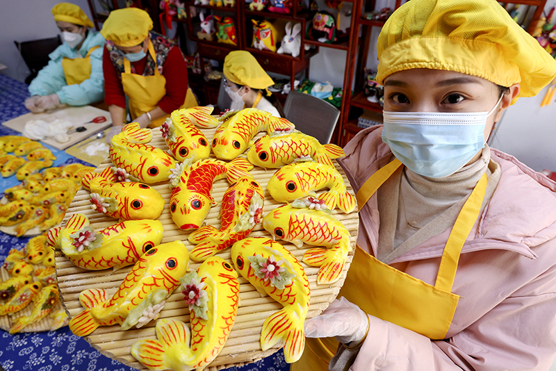 1月13日,山东省枣庄市龙山路街道居民在展示制作的传统“面鱼”。