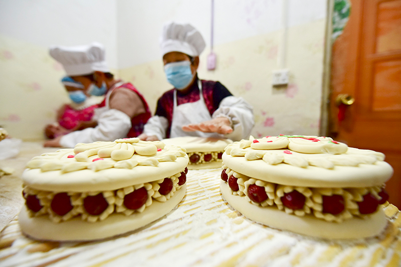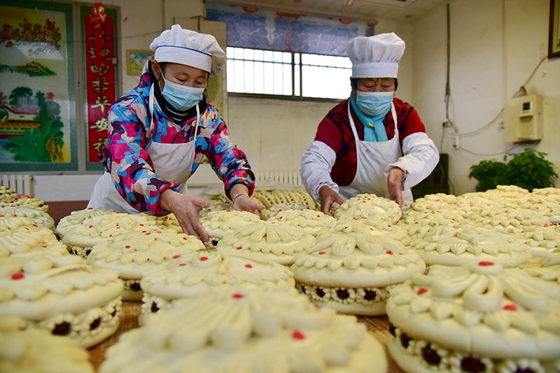 1月13日,在山东省聊城市茌平区贾寨镇肖庄村,村民在制作花糕。