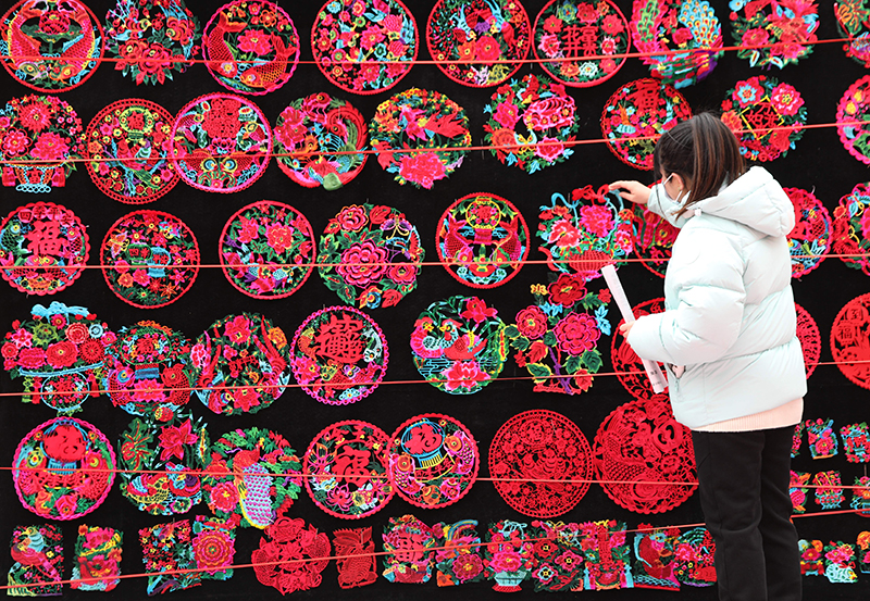 1月14日,市民在河北省承德市双桥区年货市场上选购窗花。