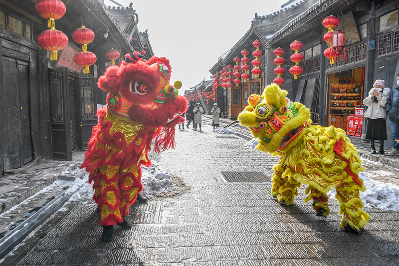 1月14日,民间艺人在山西平遥古城内表演舞狮。