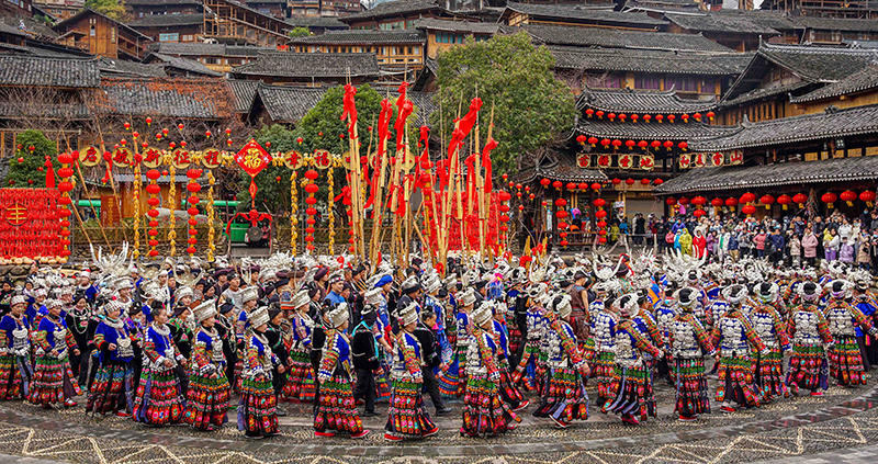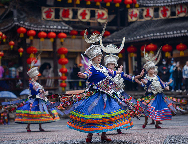 新春将至,在贵州省黔东南苗族侗族自治州雷山县西江镇,盛装打扮的村民载歌载舞,热闹迎佳节。