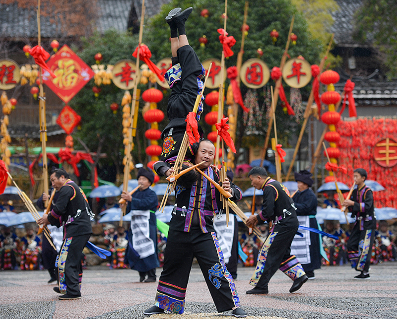 1月14日,村民在贵州省黔东南苗族侗族自治州雷山县西江镇表演节目。