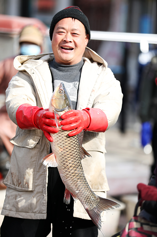 1月15日,在山东省临沂市郯城县郯城街道十里年集上,一名摊主在售卖鲜鱼。