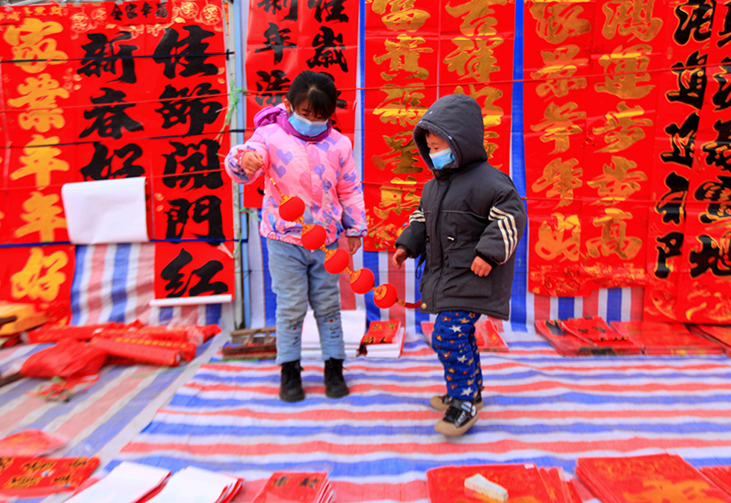 1月15日,小朋友在山东省临沂市平邑县地方镇年货大集上玩耍。