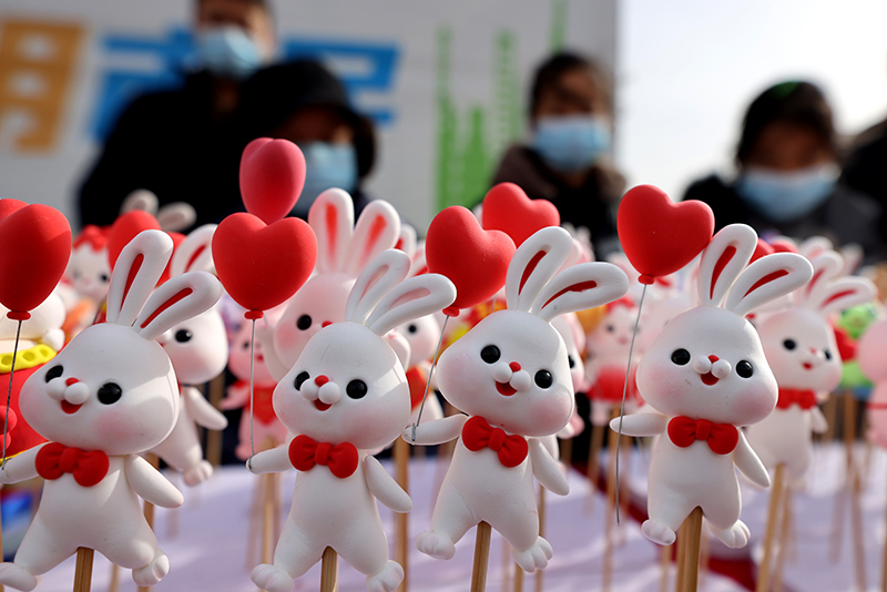 1月15日,人们在山东省枣庄市齐村大集上选购面塑“萌兔”。