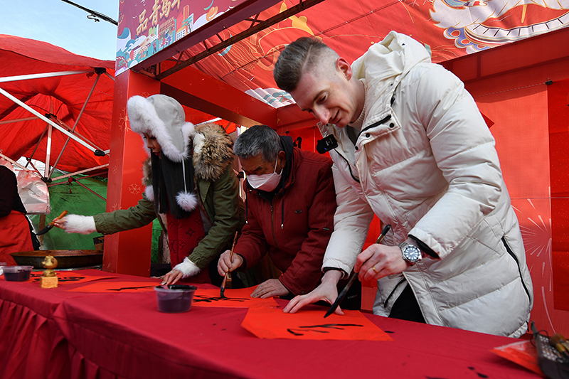 1月15日,在山东省青岛市城阳区的一场年货节活动上,一名外国游客(右)体验中国传统书法。