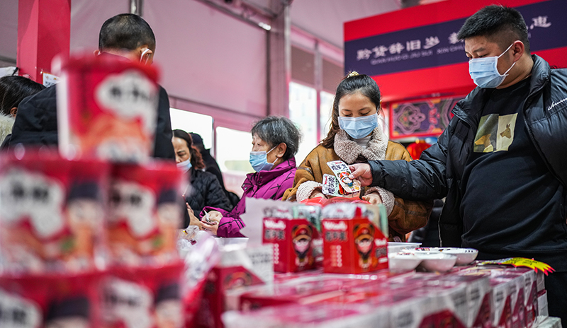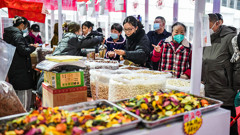 市民在贵阳市南明区兰花广场年货节现场选购商品(1月14日摄)。