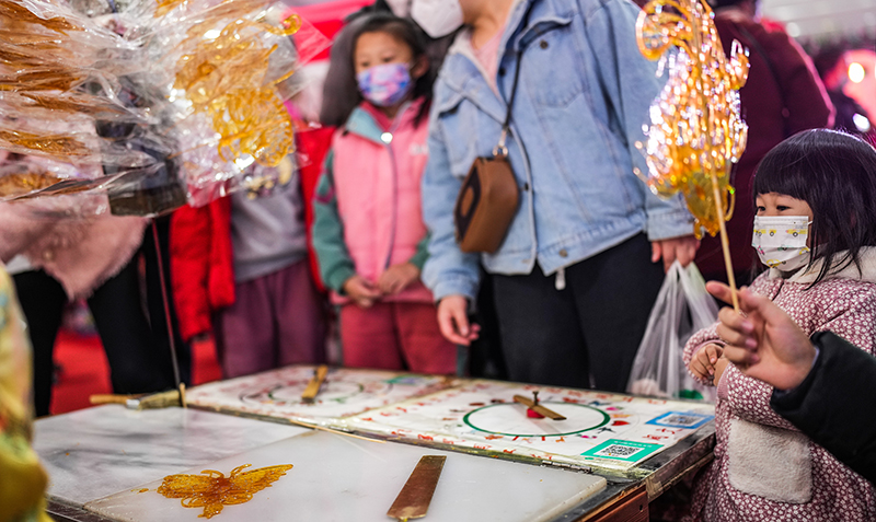 在贵阳市南明区兰花广场年货节现场,小朋友在等待糖画制作完成(1月14日摄)。