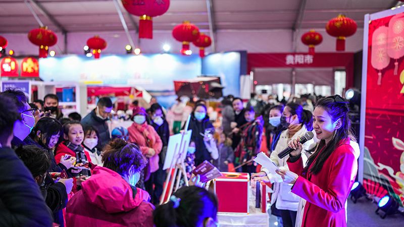 1月15日,市民在贵阳市南明区兰花广场年货节现场参加抽奖活动。