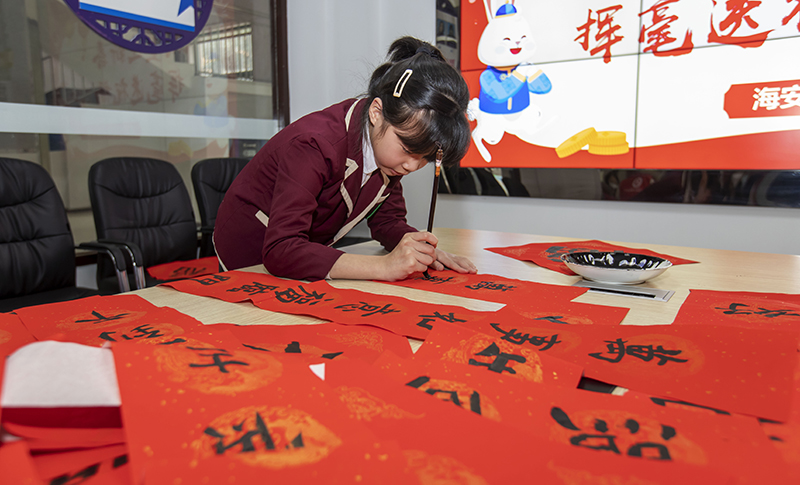 1月15日,在江苏省海安市海安街道新桥社区,海安市城南实验小学的学生在给社区居民写春联和福字。