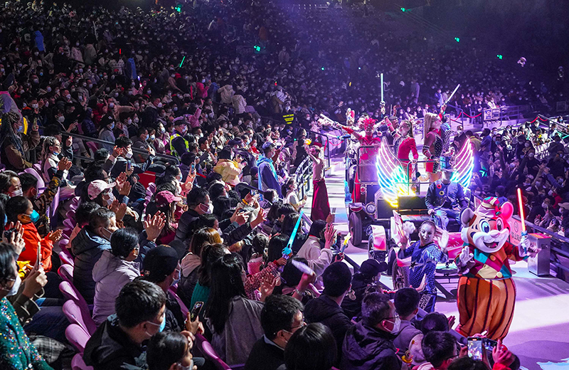 游客在广州长隆旅游度假区游园看马戏表演(2022年12月31日摄)。新华社记者 刘大伟 摄