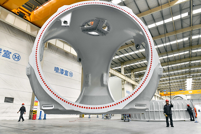 工作人员在山东省惠民县风电装备产业基地一涂装车间内作业(2022年6月7日摄)。新华社记者 郭绪雷 摄