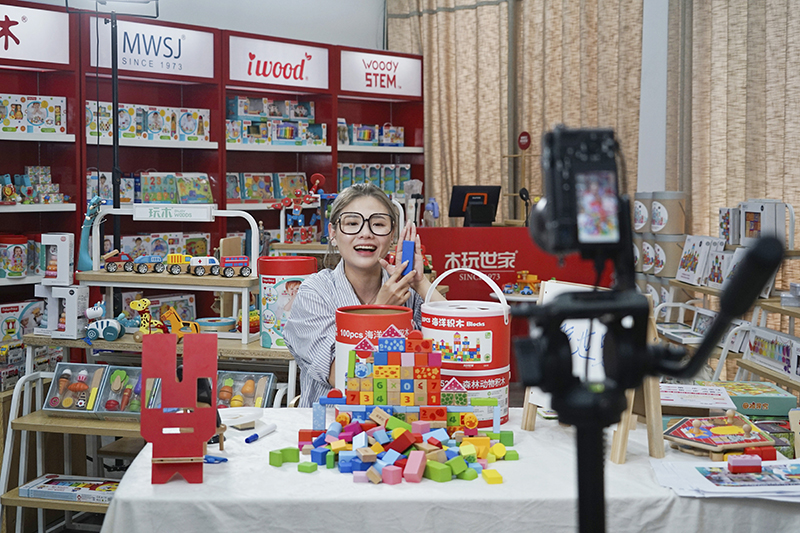 浙江云和一家玩具公司的主播在直播带货(2022年6月15日摄)。新华社记者 林光耀 摄