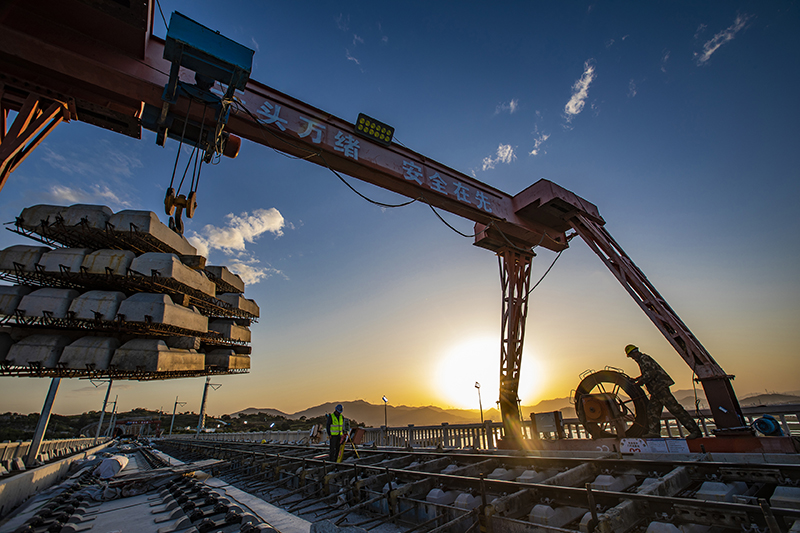 工人在新建福(州)厦(门)铁路湄洲湾跨海大桥施工(2022年4月8日摄)。新华社记者 周义 摄