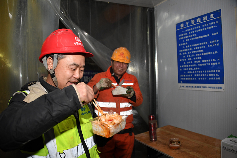 1月17日,来自重庆永川的李方华(左)在“海底餐厅”吃午饭,今年他将连续第三次在项目上过春节。