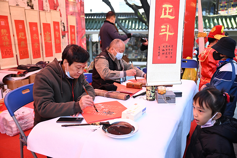 1月18日,书法家在水上花市启动仪式上为市民写春联。
