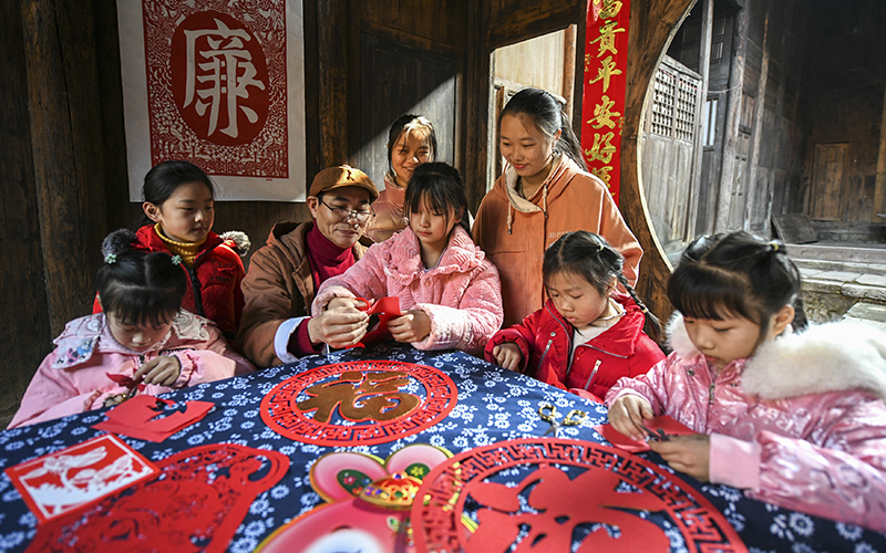 1月18日,在常宁市庙前镇中田古村,常宁市剪纸非遗传承人指导小朋友们练剪“廉”字、“福”字。