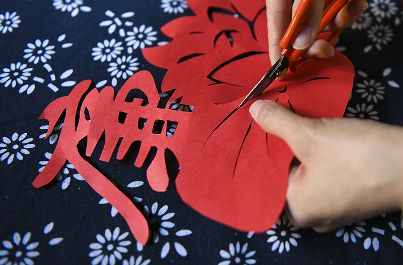1月18日,在常宁市庙前镇中田古村,常宁市剪纸非遗传承人展示剪纸技艺。