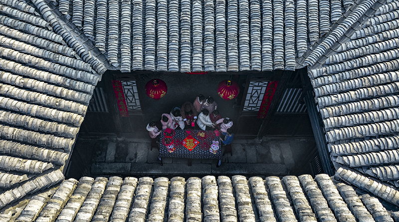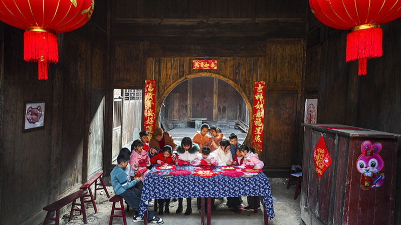 1月18日,在常宁市庙前镇中田古村,常宁市剪纸非遗传承人指导小朋友们练习剪“廉”字、“福”字(无人机照片)。