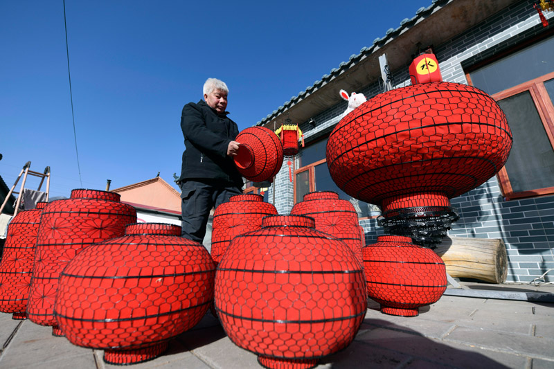 1月18日,在丰宁县选将营乡二道营村非遗就业工坊,工人在检查等待发货的铁艺灯笼。