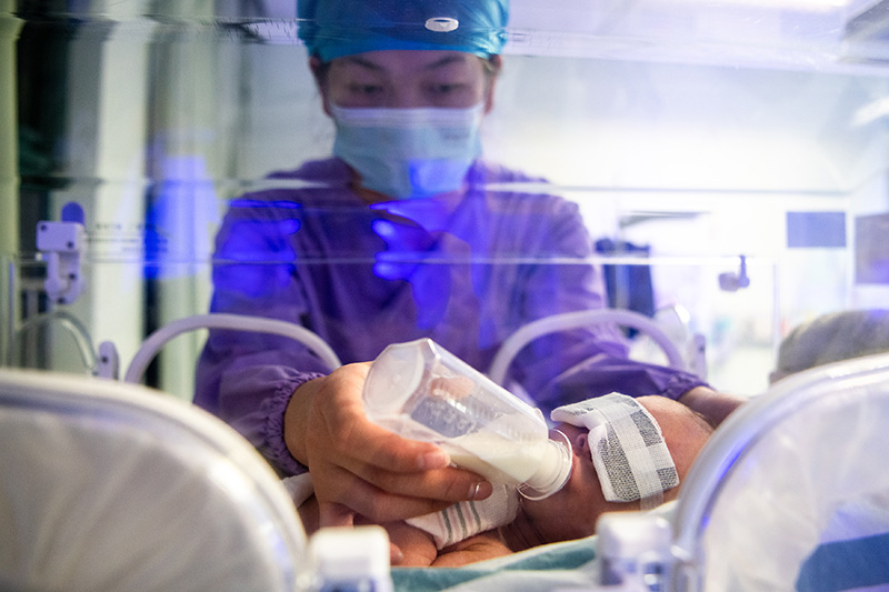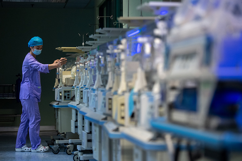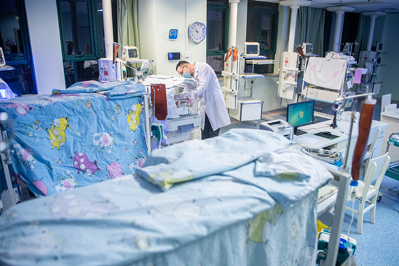 1月20日,医护人员在夜间巡房中查看患儿病情。