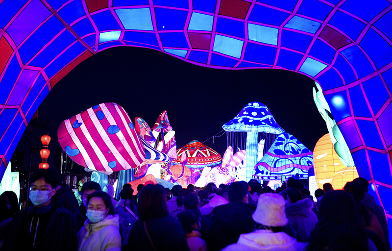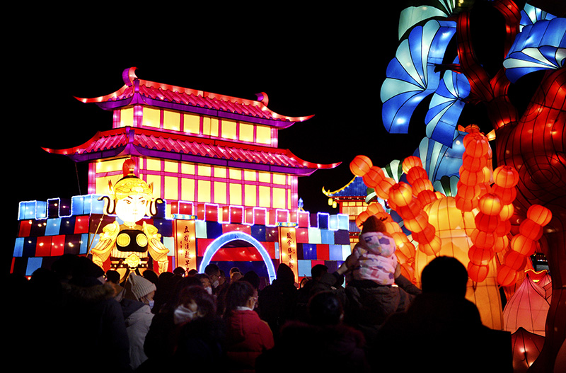 人们在西安城墙新春灯会赏灯游玩(1月20日摄)。
