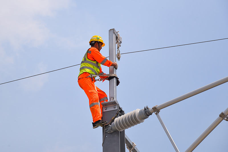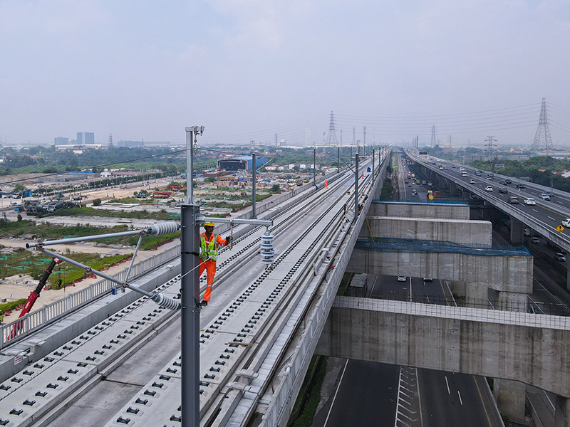 1月21日,在印度尼西亚勿加泗雅万高铁沿线,中铁电气化局印尼雅万高铁项目部施工人员进行高铁接触网附加线架设工作。