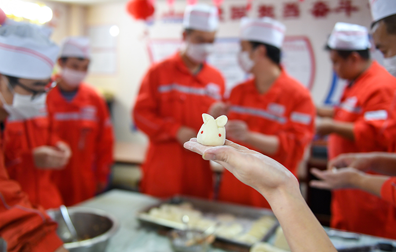 1月20日,在西江23-1平台餐厅,员工们聚在一起包饺子,准备年夜饭。