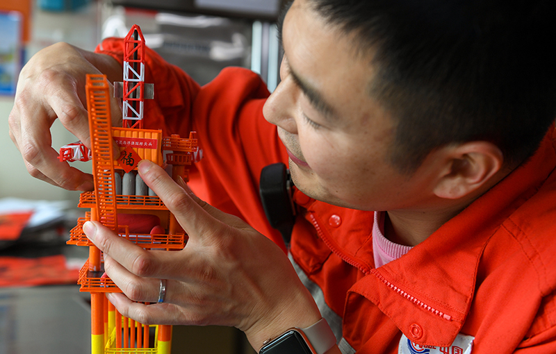 1月20日,在西江23-1平台餐厅,西江23-1平台总监高阳给自己的西江23-1模型也贴上“福”字。