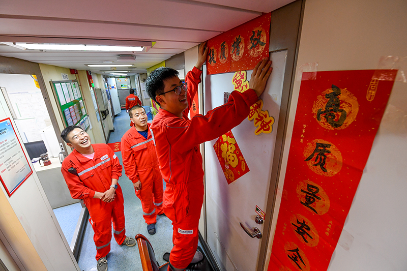 1月20日,工作人员在钻井平台的生活区张贴春联。