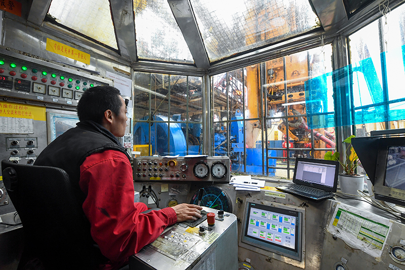 1月20日,在西江23-1平台,司钻人员在钻台控制室内操控钻机。
