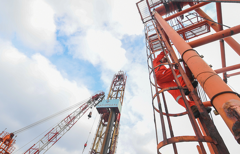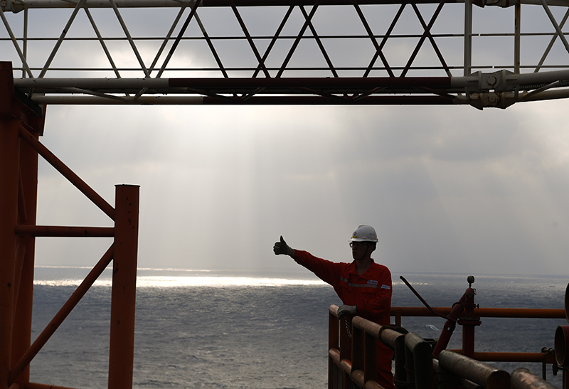 1月20日,在西江23-1平台,一名石油工作者在攀爬塔吊。