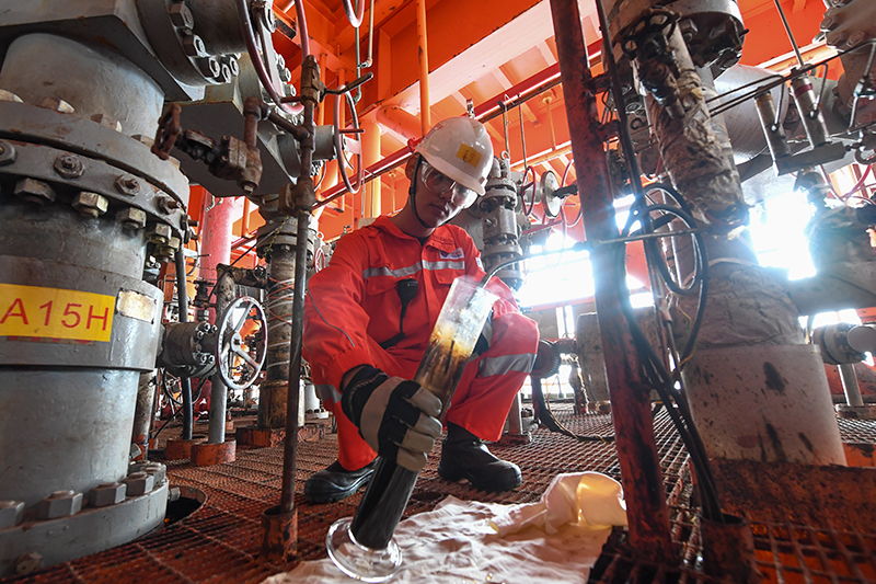 1月20日,一名石油工作者在平台26米井口采油树取油样,准备检测油中含水量。