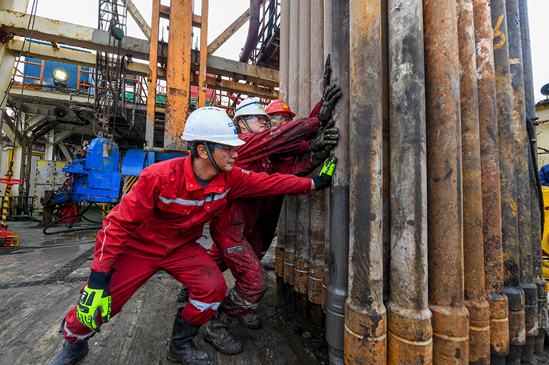 1月20日,石油工作者在钻井平台钻台区摆放钻杆。