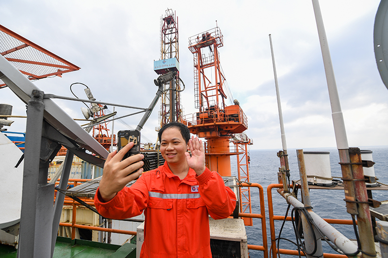 1月20日,李锡鸿在钻井平台生活区与妻子打视频电话。南海东部油田由于离岸较远,曾经长期无法收到手机信号。随着我国海上平台通信网络基础设施建设全面铺开,远离陆地的“石油人”能够经常通过手机与家人朋友联络。