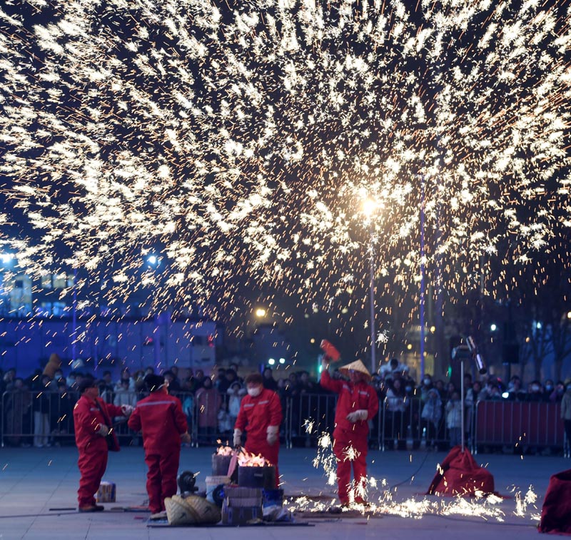 1月22日,在河北省石家庄市栾城区古栾水镇,民间艺人表演“打铁花”。