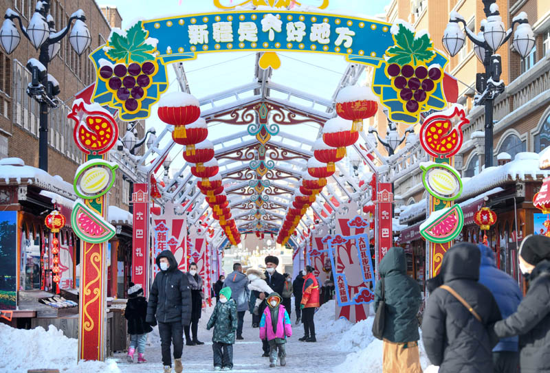 1月23日,市民和游客在乌鲁木齐大巴扎景区观光。
