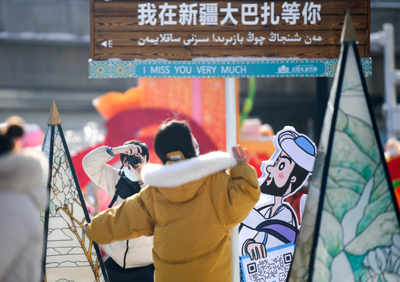 1月23日,游客在乌鲁木齐大巴扎景区拍照留影。