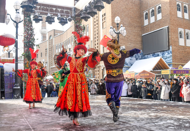 1月23日,在乌鲁木齐大巴扎景区,市民和游客观赏庆新春歌舞表演。