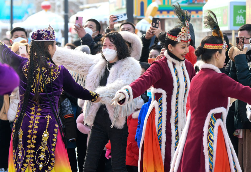 1月23日,在乌鲁木齐大巴扎景区,游客和演员一起跳起欢快的麦西来甫。